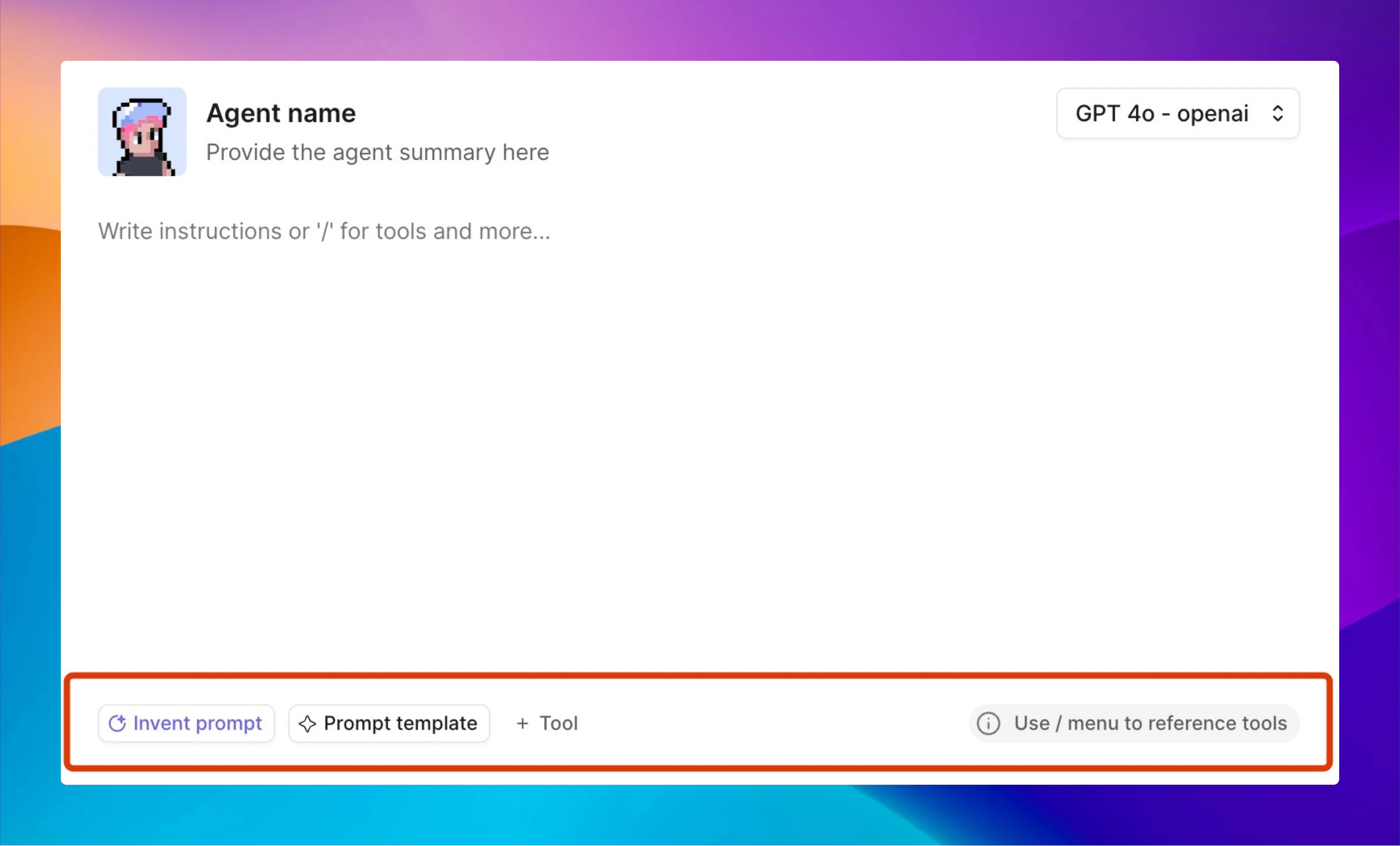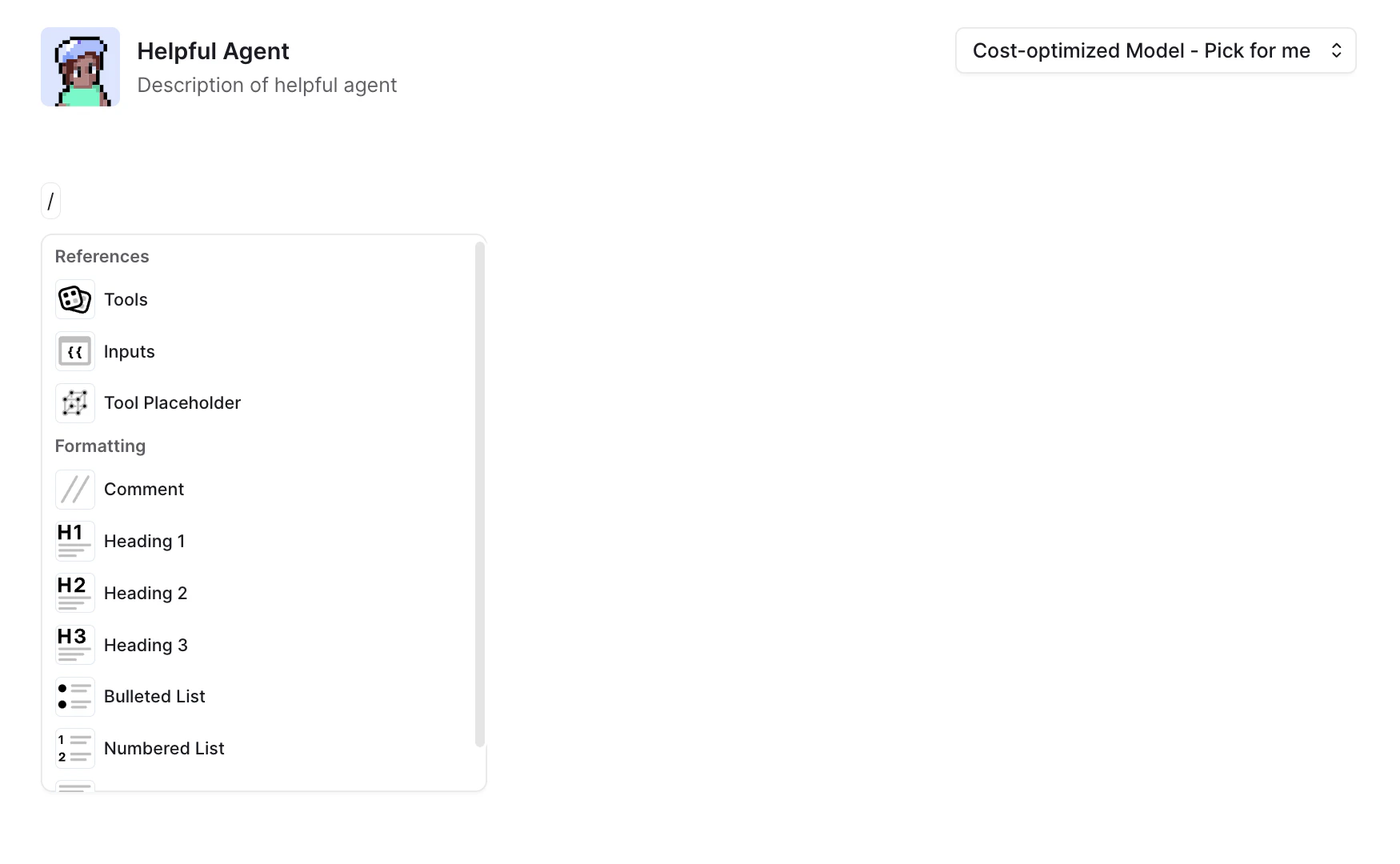 Tools allow your Agent to perform real-world actions like searching the web, sending emails, extracting data, or connecting with other systems — expanding your Agent’s capabilities far beyond simple conversation. When writing your Prompt, you can reference specific Tools directly to guide how your Agent should complete tasks. You can also insert Tool Placeholders to invent new tools or connect existing ones as needed. For a full guide on adding, configuring, and best practices for using Agent Tools, check out the Tools page.