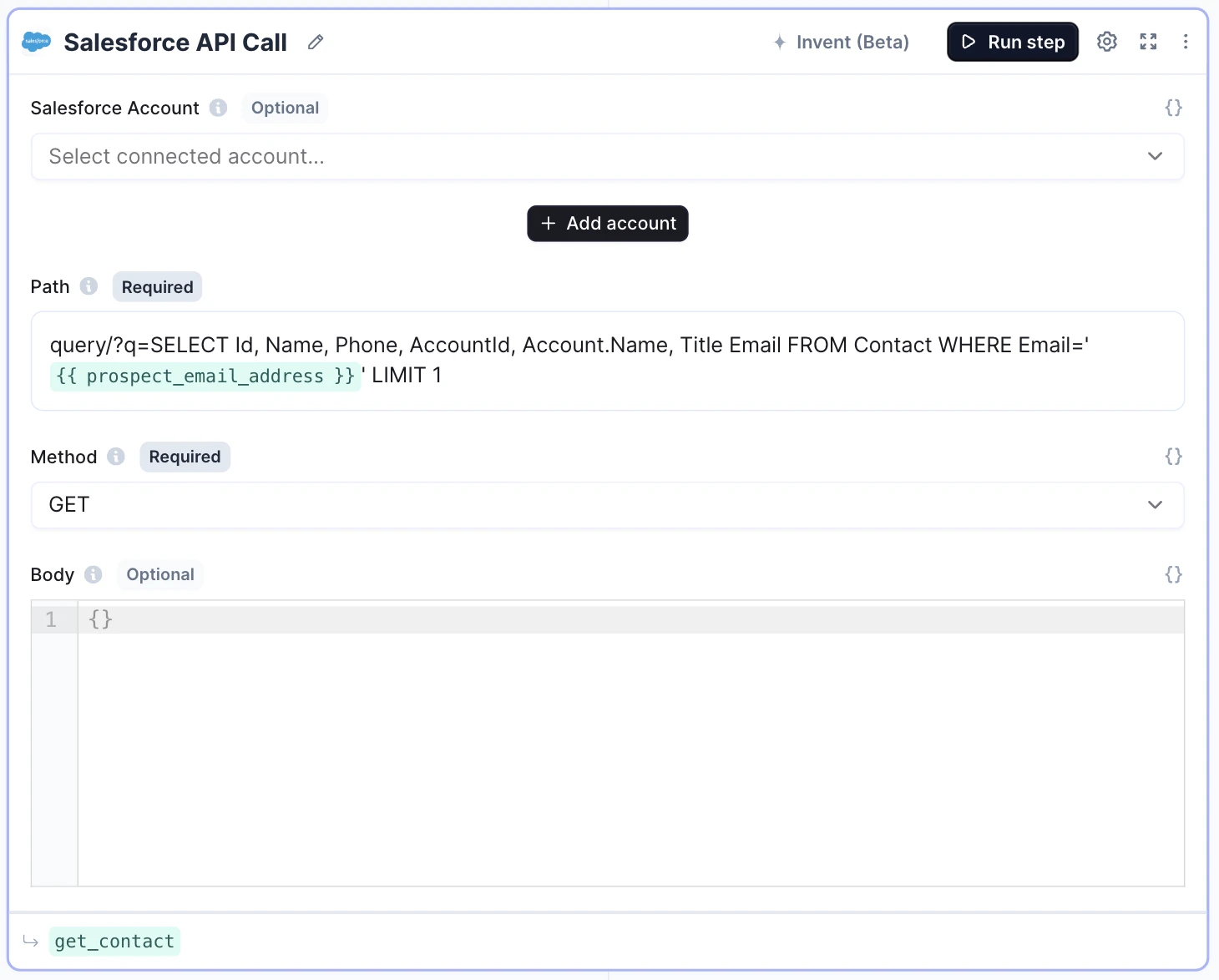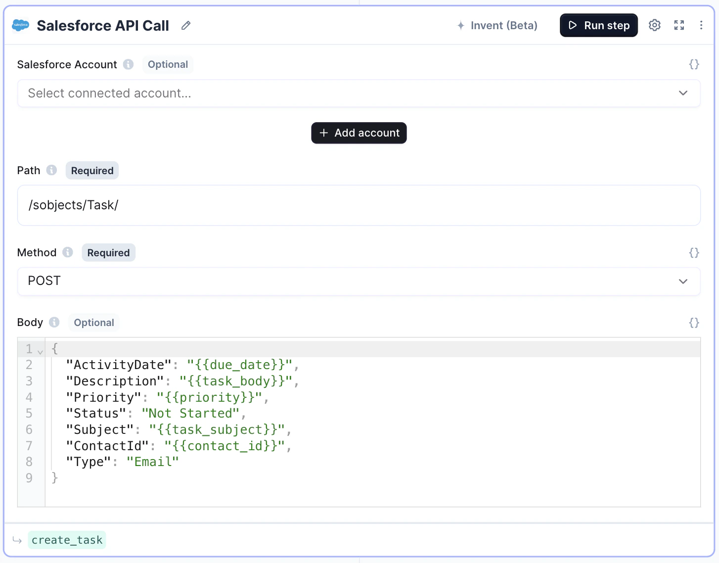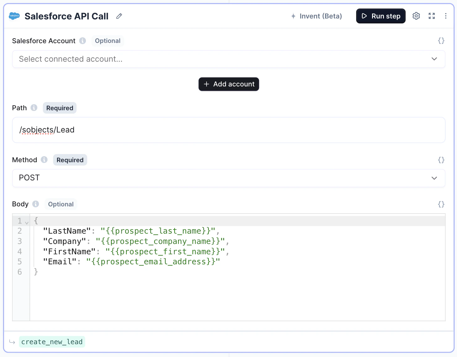 Once your account is connected, you can use the Salesforce API call step in the Tool builder. This tool step allows you to complete Salesforce-specific activities, like managing Leads, Contacts, Notes, Tasks and more.Use Salesforce API tool-step